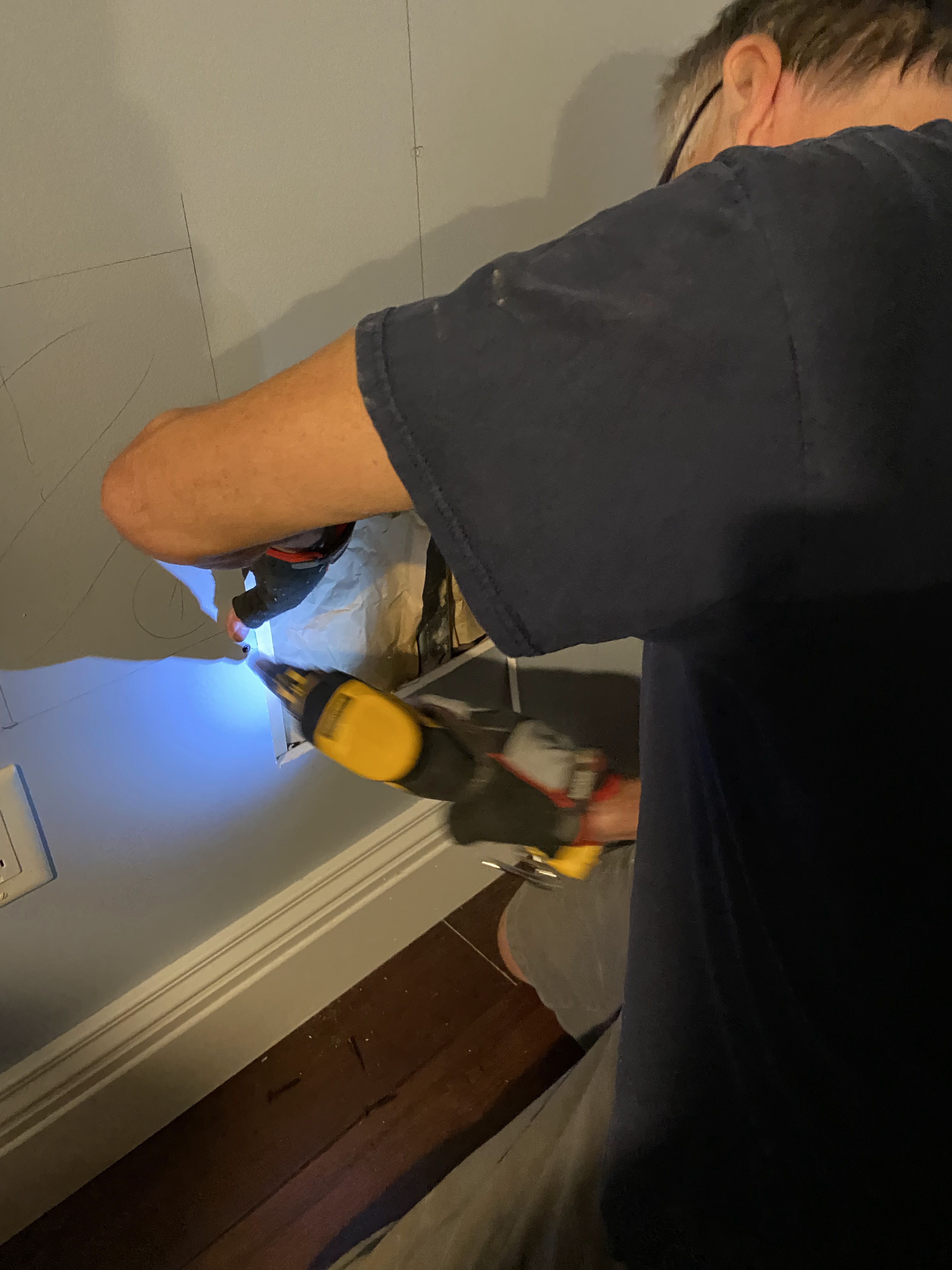 Jim worked in the shop in the morning, taking some time to organize and put away job tools. Then after lunch, it was time to start fixing the holes in the wall from the air conditioning job. The air conditioning works wonderfully when we use it, so he's confident to close everything up. First is one of those nasty jobs - insulation. This is really just soundproofing between rooms, but Jim got new insulation stuffed in...